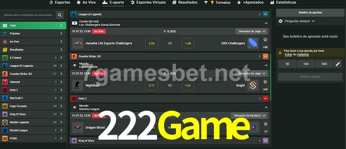 O 222Game oferece uma grande seleção de opções de apostas em e-sports com probabilidades competitivas